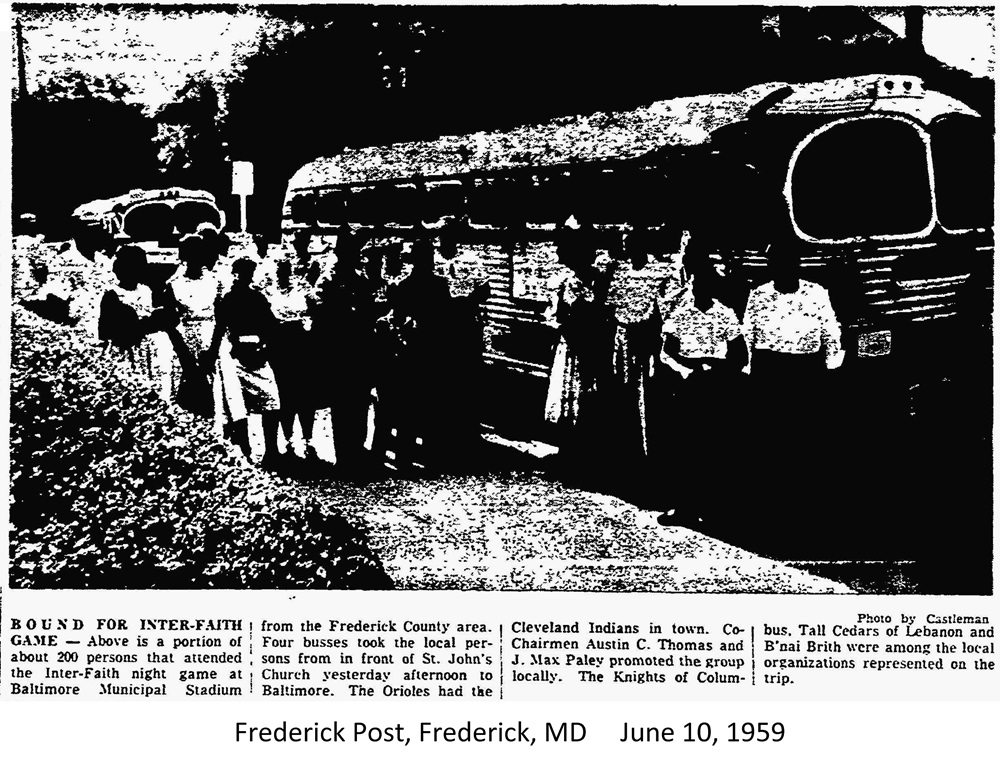 June 10, 1959. Newspaper article regarding members of St. John's Council participating in an inter-faith trip by bus from the Front of St. John the Evangelist Church in Frederick, MD to the Baltimore Municipal Stadium for a major league baseball game.