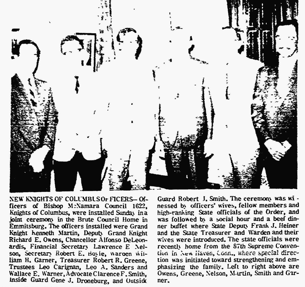 Officers of Bishop McNamara Counicl 1622, Knights of Columbus, were installed Sunday, August 24, 1969, in a joint ceremony in the Brute Council Home in Emmitsburg. The officers installed were Grand Knight Kenneth Martin, Deputy Grand Knight Richard E. Owens, Chancellor Alfonso DeLeonardis, Financial Secretary Lawrence E. Nelson, Secretary (Recorder?) Robert E. Boyle, Warden William H. Garner, Treasurer Robert E. Greene, Trustee Leo Carigan, Trustee Leo A.Sanders, Trustee Wallace E. Warner, Advocate Clarence F. Smith, Inside Guard Gene J. Droneburg, Outside Guard Robert J. Smith. The ceremony was observed by Maryland State Deputy Frank J. Heiner, the Msryland State Treasurer and the Maryland State Warden.