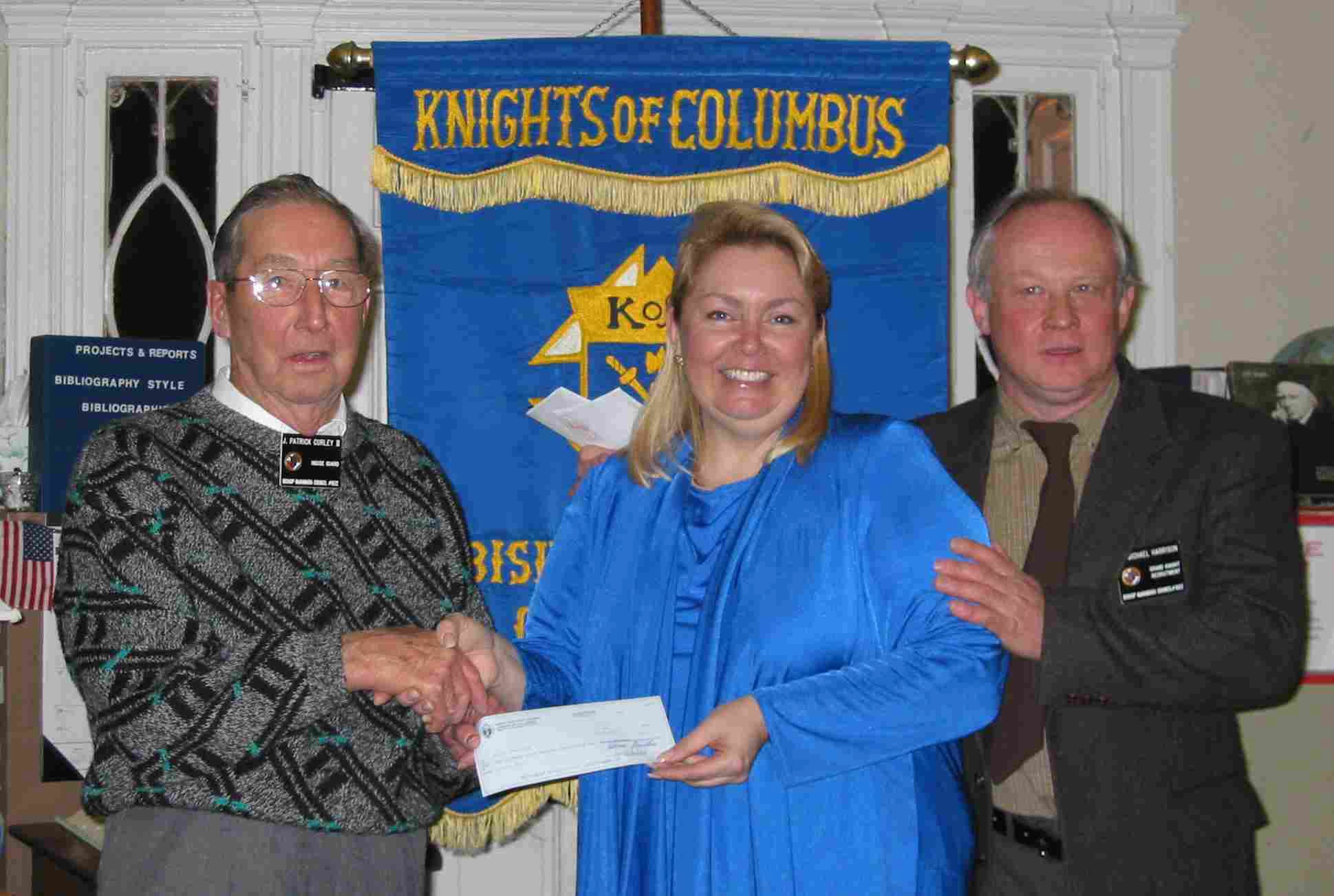 March 4, 2002 - During our monthly social meeting, Tootsie Roll Chairman Br. John Patrick Curley III (L) presents a check for over $2300 to Ms. Beate Frankel (C), Development Director for ARC of Frederick. Grand Knight Michael Harrison (R) assists. This check represents money collect by Bishop McNamara Council during our 2001 Annual October Tootsie Roll Drive. Ms Frankel then spoke to our council members on the current focus and activities of ARC.