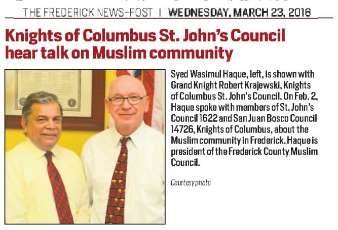 Dr. Syed Wasimul Haque (L) stands with Grand Knight Robert Krajewski, KofC St. John's Council, at Community Center of St. John the Evangelist Church in Frederick, MD. Dr. Haque spoke with members of St. John's Council #1622 and San Juan Bosco Council #14726, Knights of Columbus, concerning the Muslim community in Frederick. Dr. Haque is a physician at Frederick Memorial Hospital and President of the Frederick County Muslim Council.