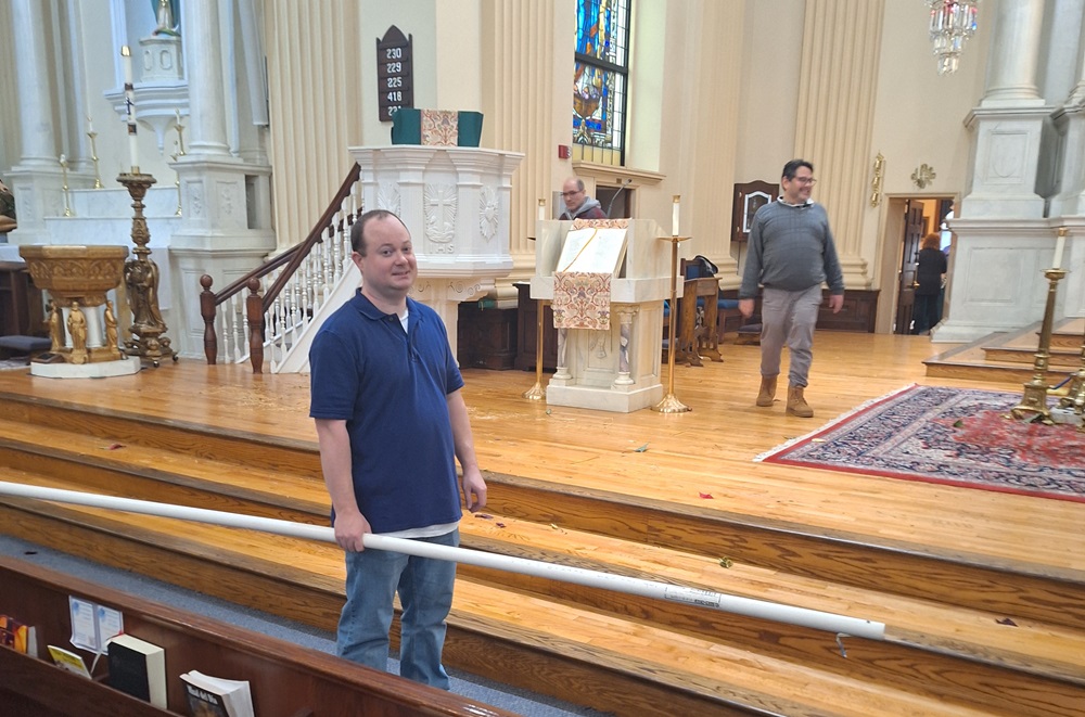 January 7, 2024 - Knights and family members help tale-down Christmas decorations at St. John the Evangelist Church. (LtoR) Br. Michael Delaney, Br. Jose Davila (behind the Ambo) and Br. Frederico Rostran.