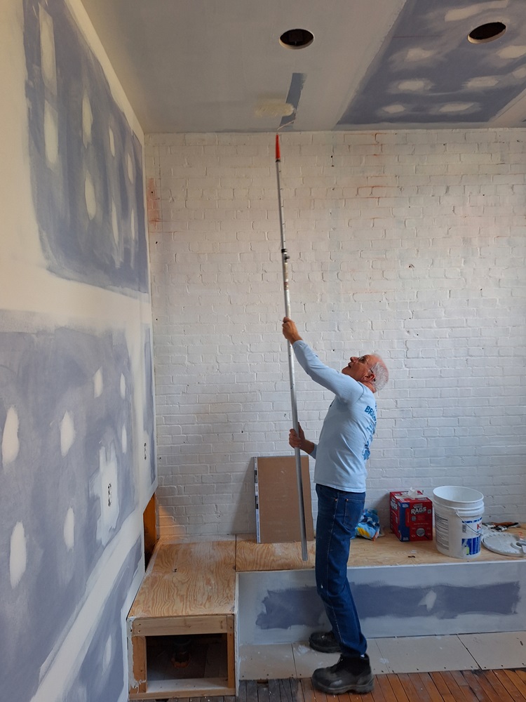 On Friday, February 2, 2024, Painting future warming kitchen behind the parish hall; PGK Rick Casazza rolling the ceiling.
