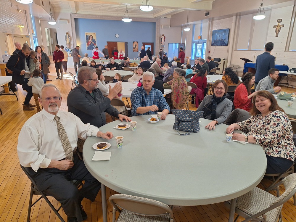 Organist and some choir members at the front table enjoy a donut and coffee after singing at the 9am Mass.