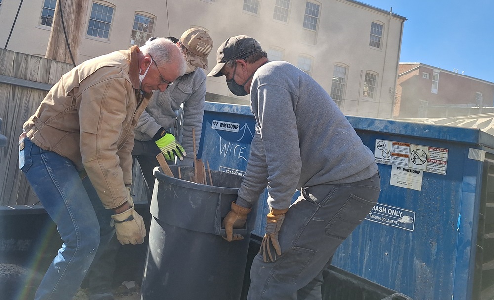 (LtoR) PGK Rick Casazza, Br. Federico Calzamiglia, and Br. Steve Wichtendahl empty a debris container in the dumpster.