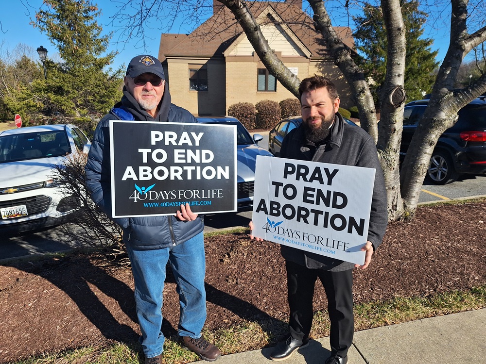 On Wednesday, February 12, 2024 - Knights support the first day of the Frederick County Right to Life's 40 Days for Life Prayer Vigil at the Planned Parenthood office on Thomas Johnson Drive. (LtoR) Br. Jim Schneck and Rev. Matt DeFusco.