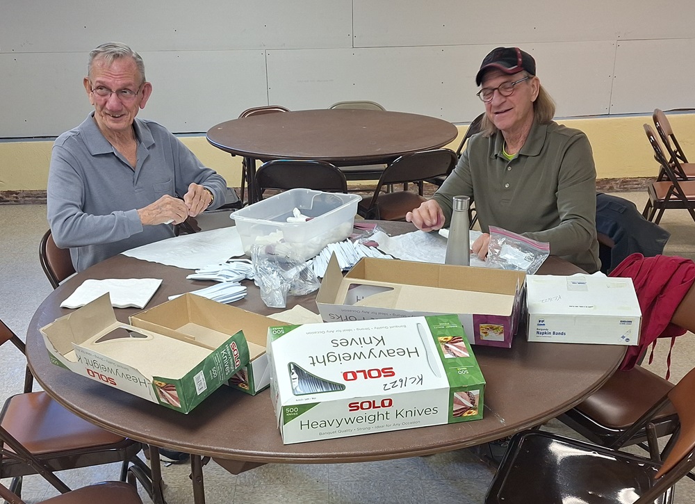 On Friday, February 16, 2024 - Knights and family members served our first Friday Lenten fish fry for 2024. (LtoR) Br. Pete Tokar and PGK Jim Sier wrapping utensils.