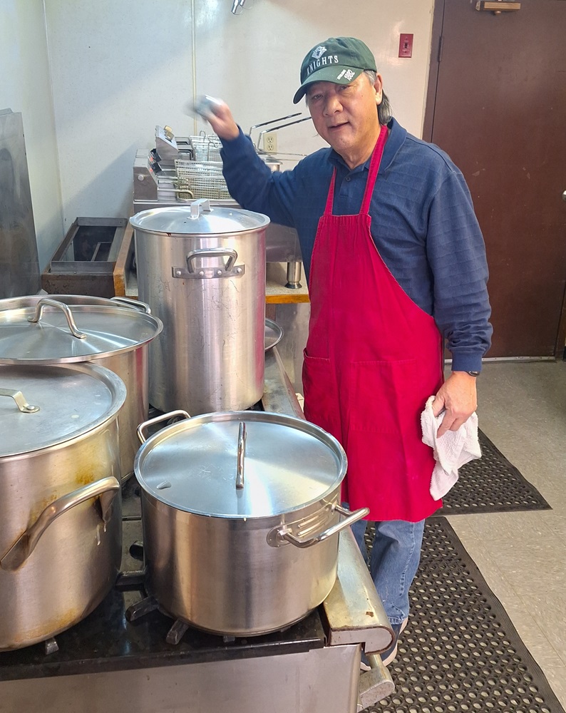 On Friday, February 16, 2024 - Knights and family members served our first Friday Lenten fish fry for 2024. (LtoR) Head chef Br. Maurice Wong checking his soup in the kitchen.
