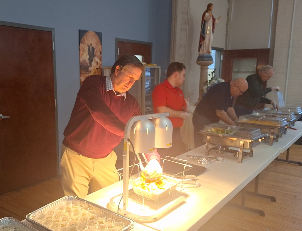 On Friday, February 16, 2024 - Knights and family members served our first Friday Lenten fish fry for 2024. (LtoR) PGK Lee Ericksen, Br. Alex Sohm, Br. Bill Sohm and Br. Bob Willson on the serving line.