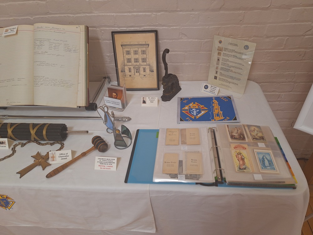 Table of historic heirlooms on display in the hall during the fish fry. Items provided for both the KofC St. John's Council No. 1622 and the St. John the Evangelist Catholic Church.