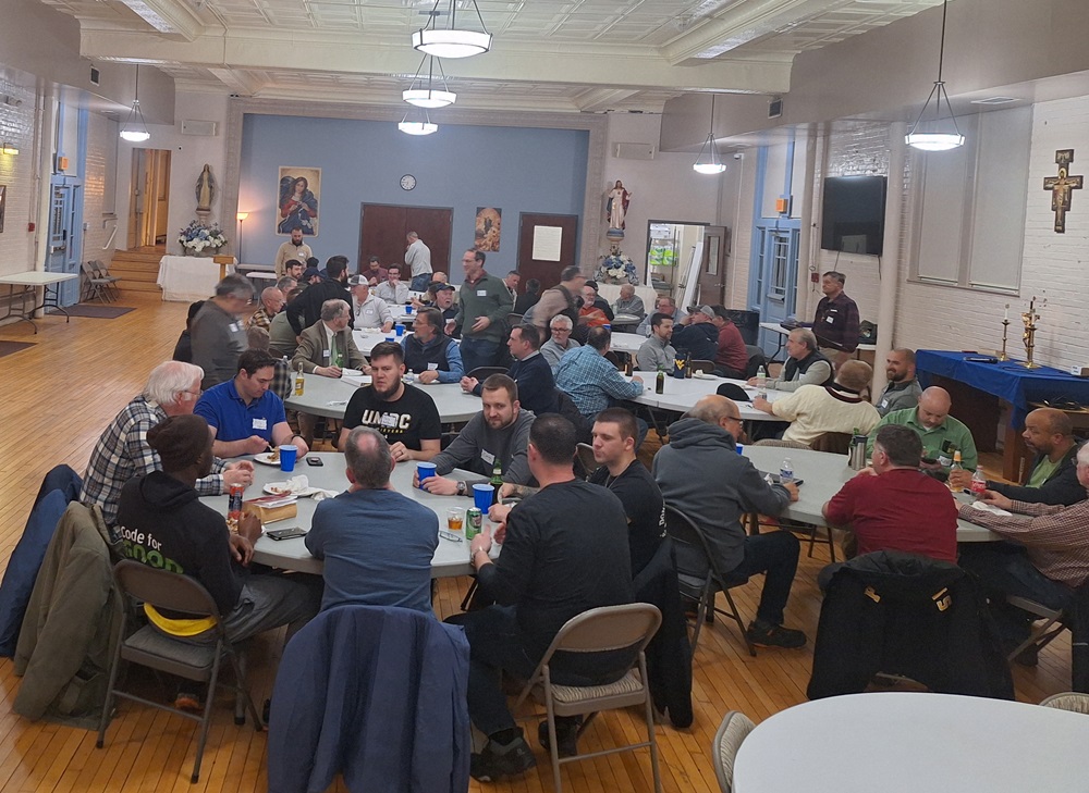 On Tuesday, February 20, 2024 - Knights prepare and serve a meal of roasted chicken to the Pastorate's Men's Formation Feast in the parish hall of St. John the Evangelist Church, Frederick, MD. Dinner time.