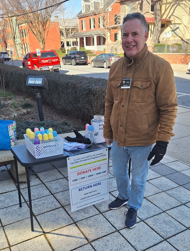 On Sunday, February 25, 2024 - - Knights stand outside after a Mass at St. John the Evangelist Church to collect for our annual "Baby Bottle Campaign". All proceeds go to the Care Net Pregnancy Center of Frederick, which supports mothers who choose life.