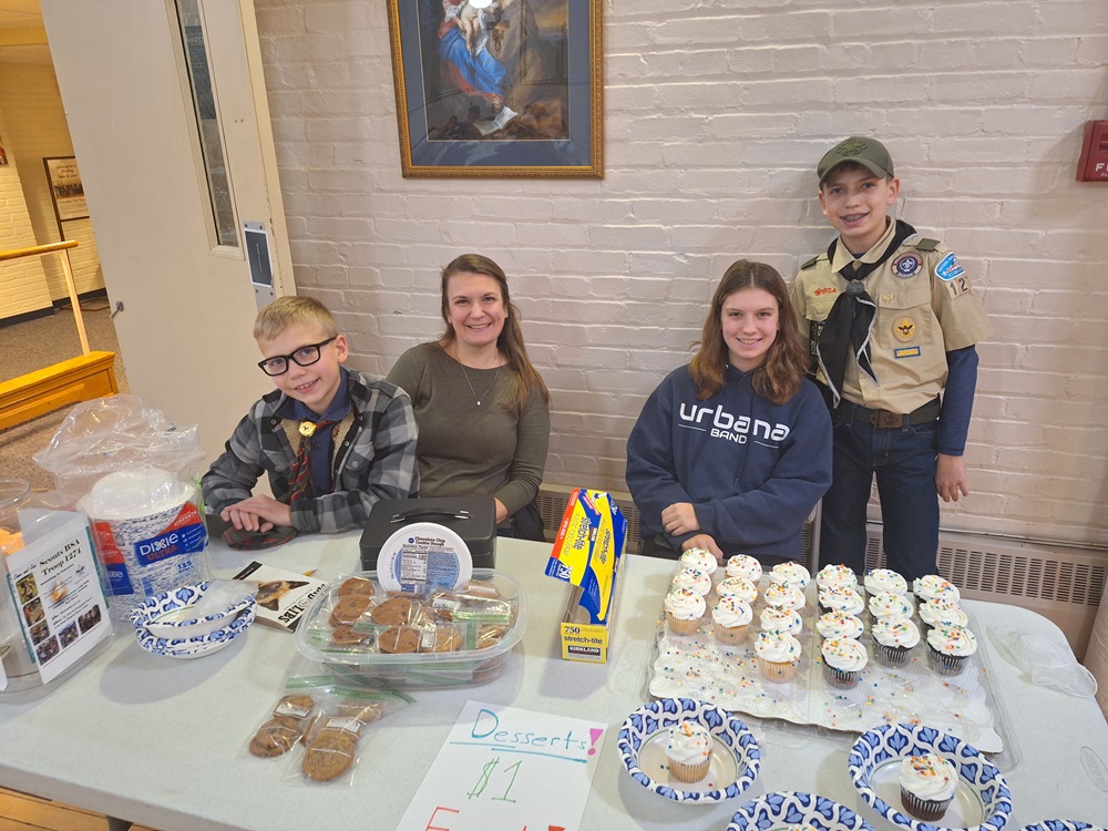 March 1, 2024 - Knights serve their third Fish Fry for 2024 in the hall of the Sister Margaret Bauer Evangeliszation Center at St. John the Evanggelist Church. Boy Scouts and parents man the dessert table.
