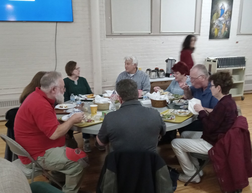March 1, 2024 - Knights serve their third Fish Fry for 2024 in the hall of the Sister Margaret Bauer Evangeliszation Center at St. John the Evanggelist Church. Choir members and families. Cindy and PGK Dave Satterfield on right side of table.