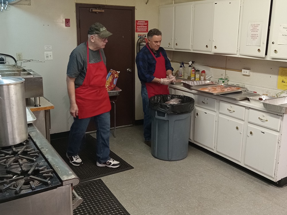 March 1, 2024 - Knights serve their third Fish Fry for 2024 in the hall of the Sister Margaret Bauer Evangeliszation Center at St. John the Evanggelist Church. (LtoR) PGK Bob Krajewski and Br. Bill Bond working in the kitchen.