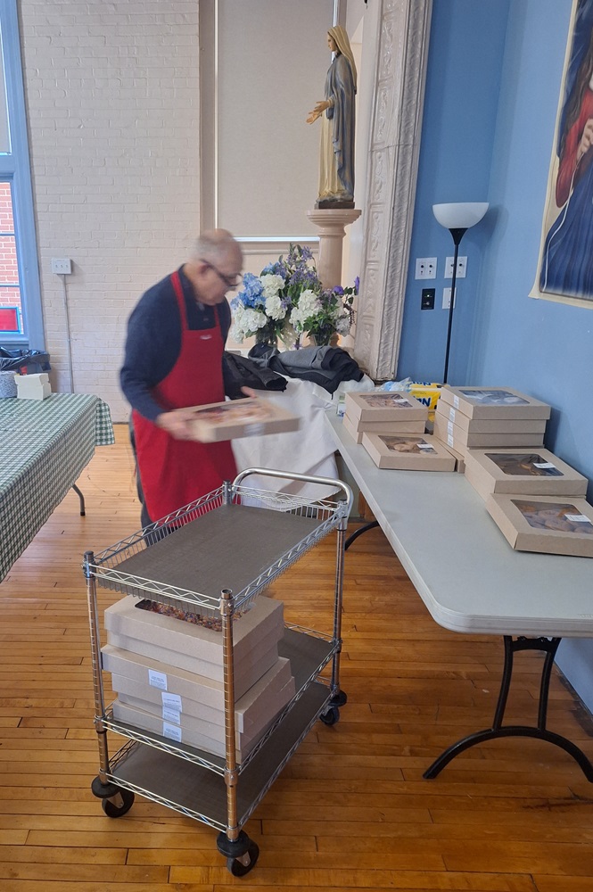 Sunday, March 3, 2024 - Knights host their monthly coffee and donuts social in the hall of the Sister Margaret Bauer Evangeliszation Center at St. John the Evanggelist Church. Br. John Fischer arranges some donuts.
