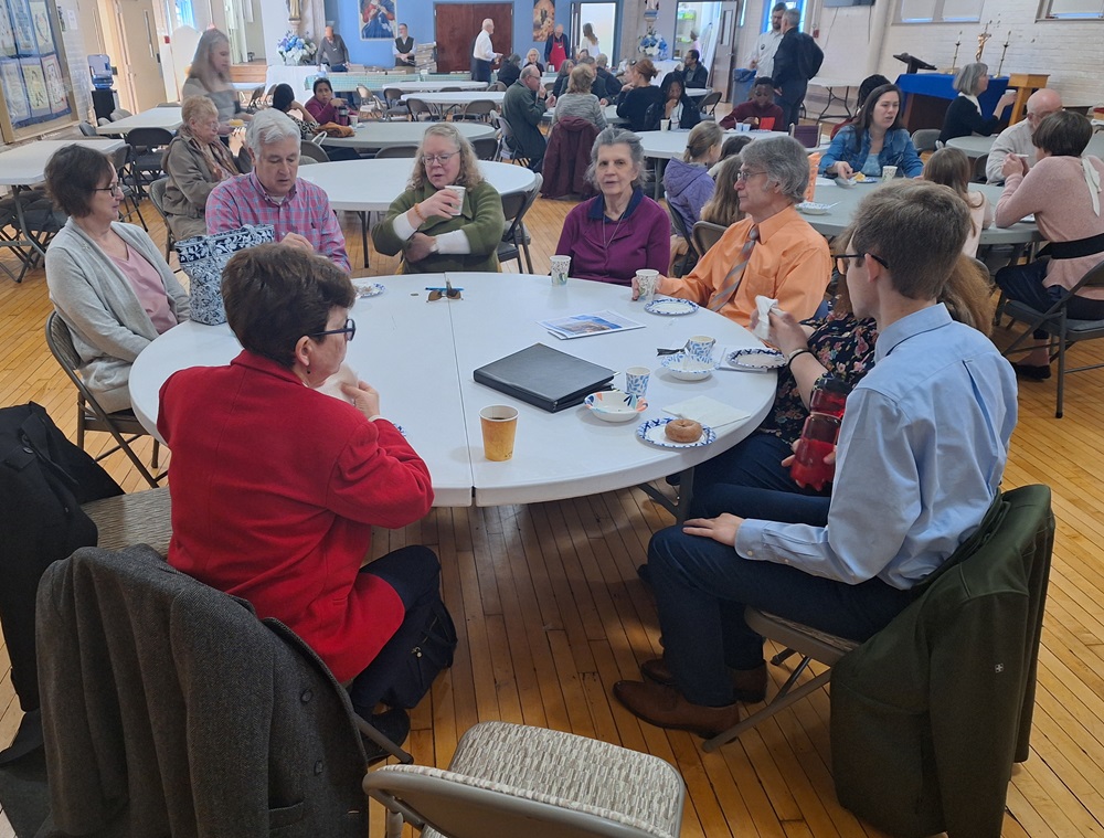 Sunday, March 3, 2024 - Knights host their monthly coffee and donuts social in the hall of the Sister Margaret Bauer Evangeliszation Center at St. John the Evanggelist Church. (LtoR) Choir members and their families enjoy a donut.