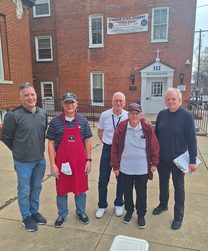 Friday, March 15, 2024 - Our Fifth KofC Lenten Fish Dinner at St. John the Evangelist Church. Another successful night with a great team. (LtoR) Br. Sean McFarland, Br. Maurice Wong, PGK Rick Casazza, Br. Woody Johnston, and Br. William Key.