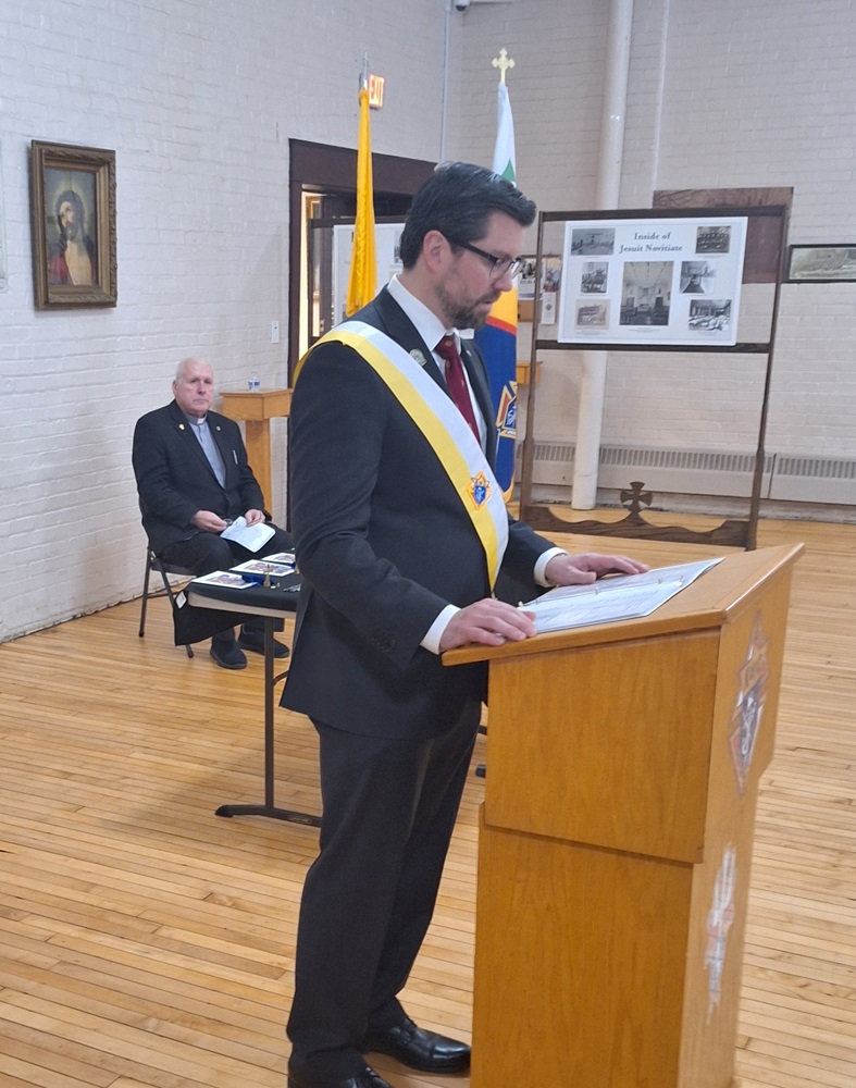 Grand Knight Rick Babbitt begins the ceremony, observed by Deacon Doug Nathan in rear.
