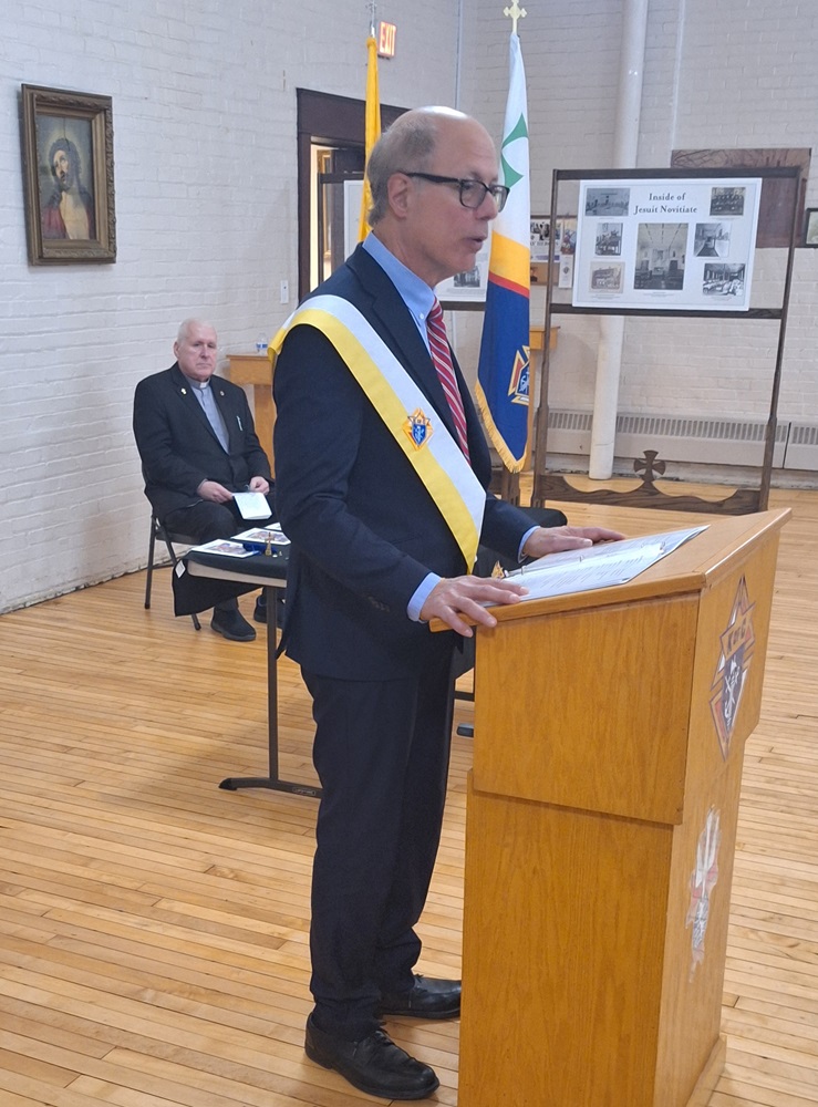 Degree team member Br. Jack Vivona explains one of the principles of the Knights of Columbus, observed by Deacon Doug Nathan in rear.
