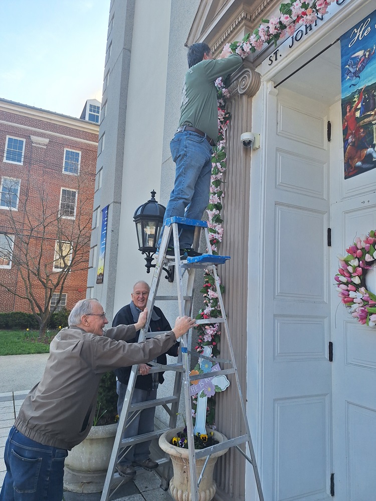 March 30, 2024, Holy Saturday morning. Knights help decorate St. John the Evangelist Church. Coordinated by Church Actvities Director Br. William Key. (LtoR) Br. Bob Willson and Br. Woody Johnston hold the ladder for PGK Lee Ericksen.