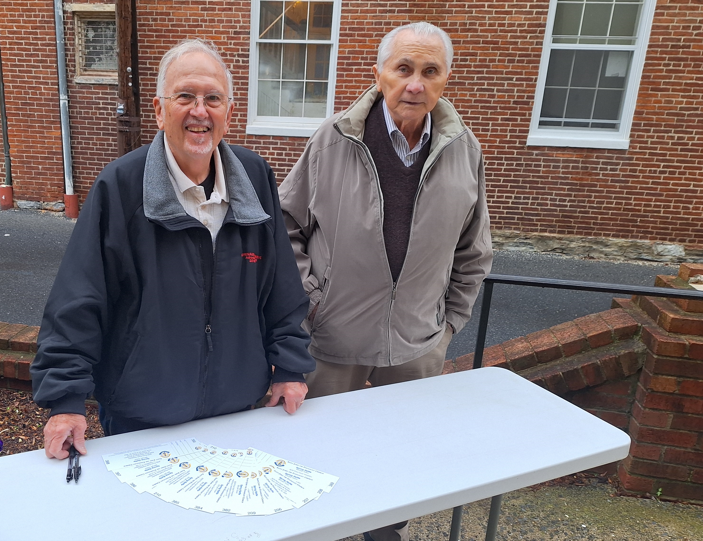 Saturday, April 27, 2024 - Knights selling Spring Raffle tickets for St. John's Maintenance Fund. in Frederick, MD. Photo (LtoR): Br. Woody Johnston and PGK Julio Valcarcel.