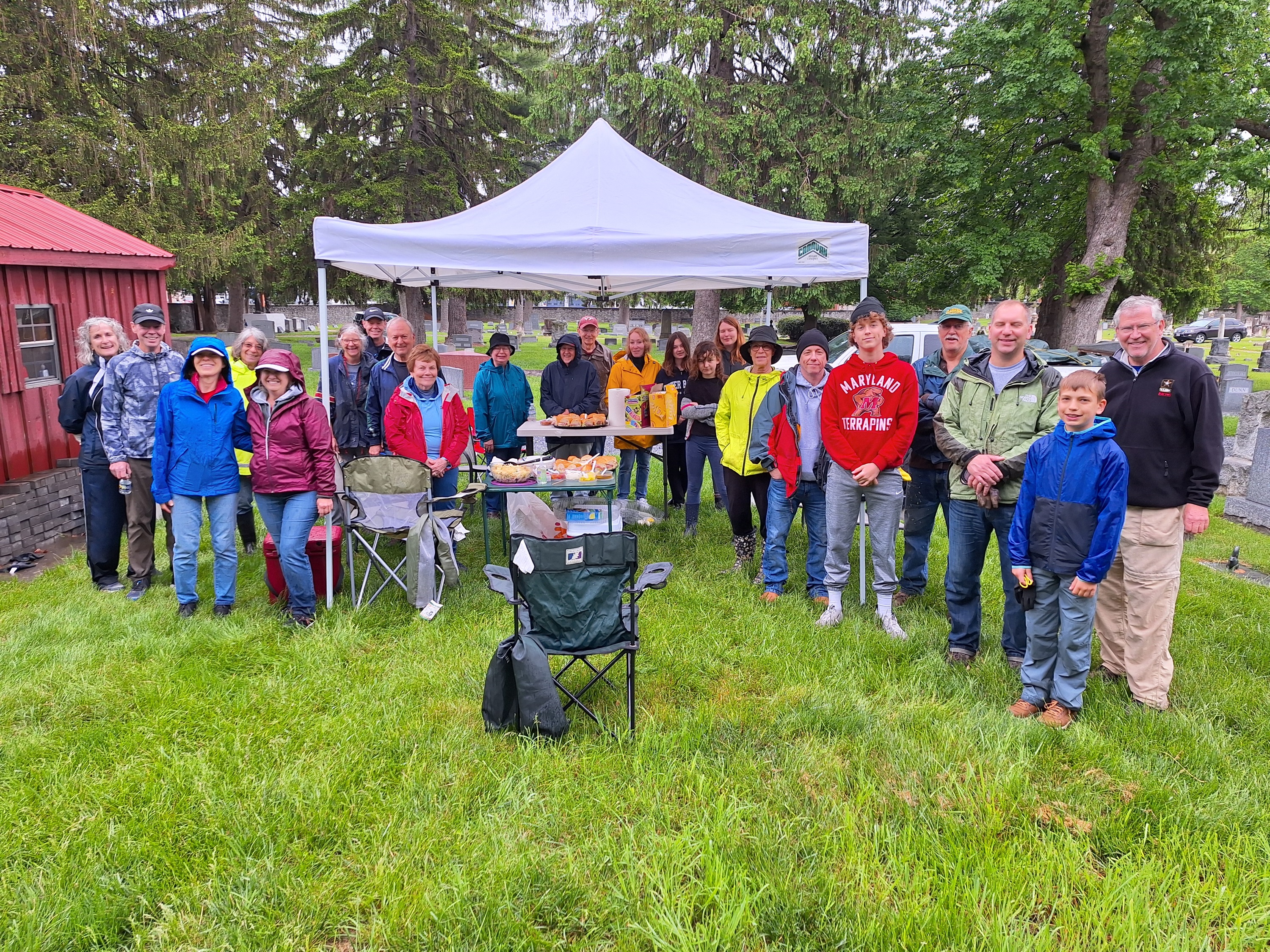 May 4, 2024 - Four Knights (Br. Woody Johnston, Br. Andy Nuce, Br. Dave Satterfield, and Br. Bob Willson) and some of their family members, assisted with the annual Spring clean up today at the St. John's Cemetery. The mild, intermittent rain didn't deter this dedicated team.