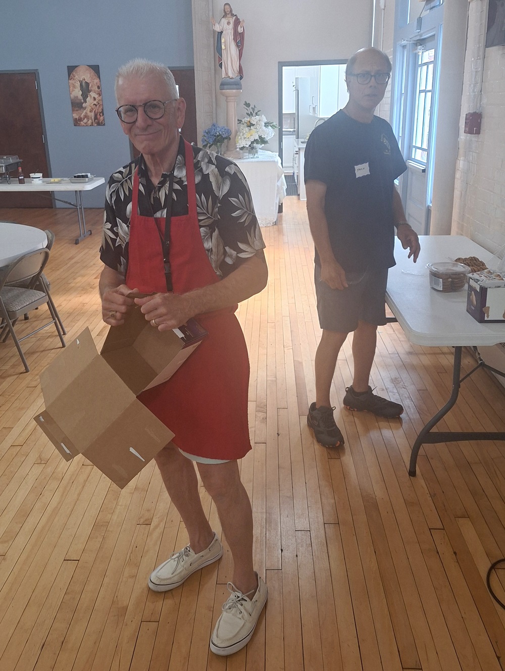 July 9, 2024. Knights prepare and serve dinner for Fr. Matt's monthly Men's Feast in the hall of St. John the Evangelist Church. (LtoR): PGK Rick Casazza and Br. Jack Vivona prepare food tables.