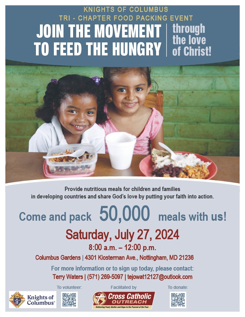 Poster for the July 27, 2024 annual KofC Maryland Food Packing Event sponsored by three Grand Knight Chapters. In this Knight's 5th annual food packing event, 160 Knight volunteers broke into 16 teams of 10 to prepare 8,748 "Ready to Eat" packets of rice, beans, soy and dried vegetables all destined to Cross Catholic missionaries in Guatemala.