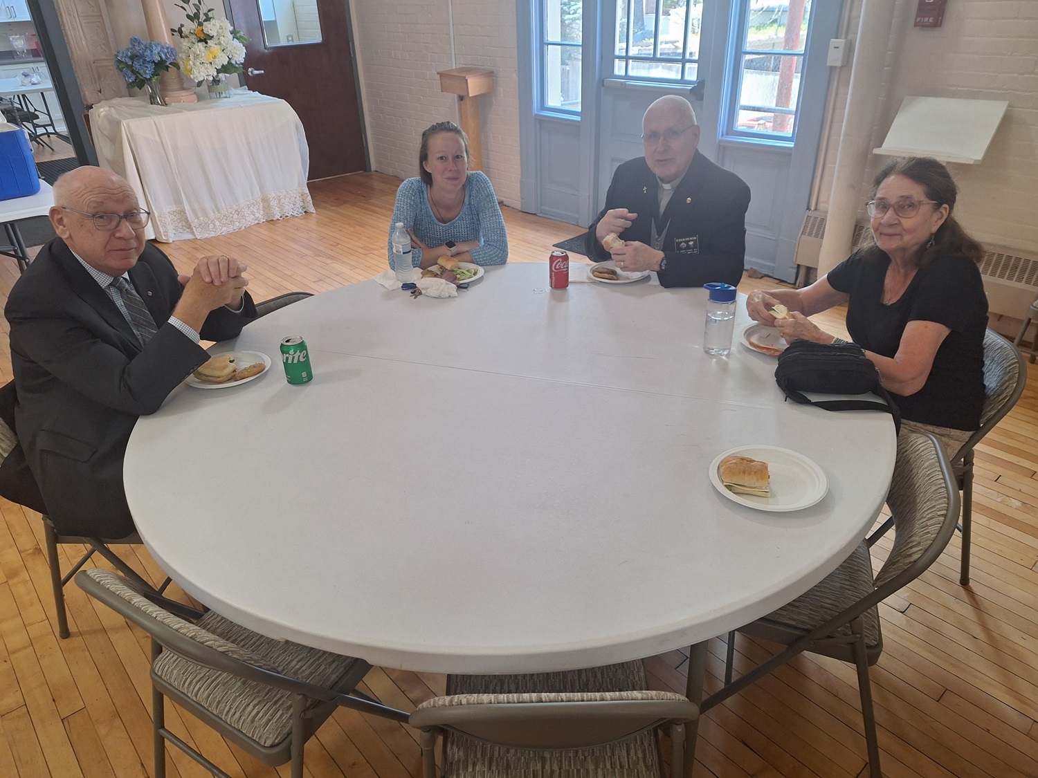 Lunch after the ceremony. Photo (LtoR, clockwise from left): PGK Bob Krajewski, Megan McQuin, Deacon Doug Nathan, and Chris Fischer.