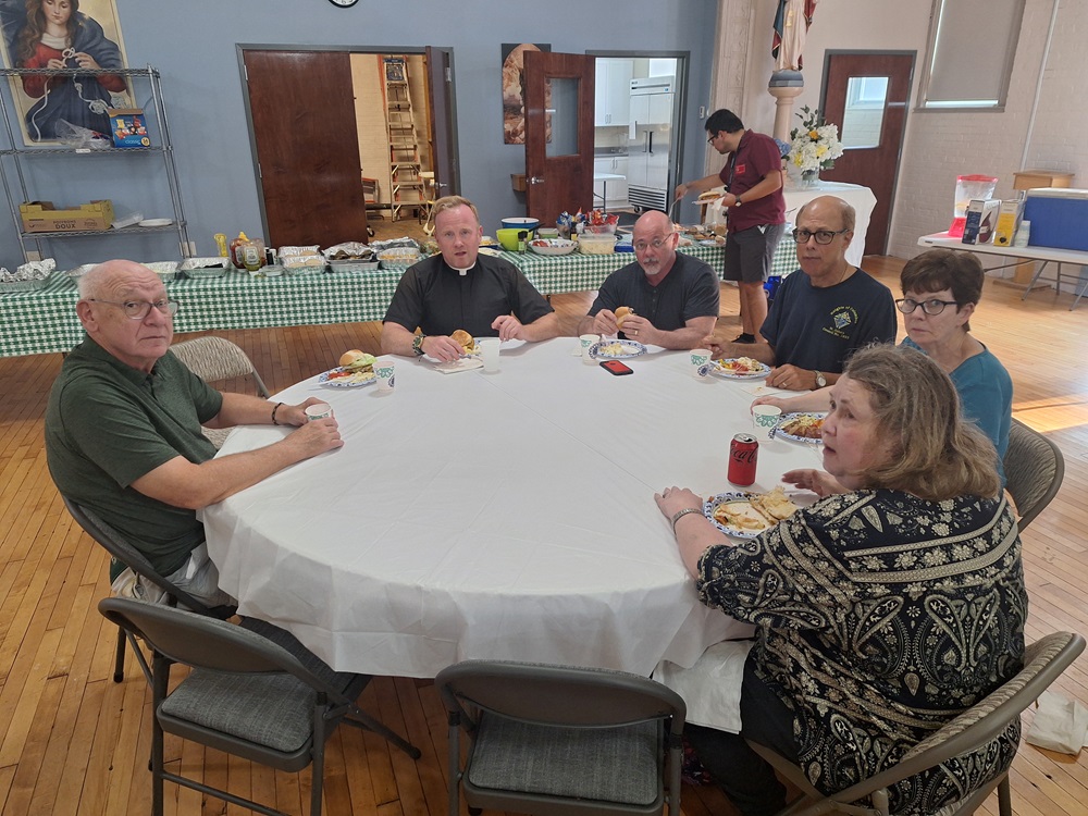 On Tuesday, August 6, 2024, We had a great turnout for our monthly council family cookout at St. John the Evangelist Church and ate in the parish hall at St. John the Evangelist Church due to the high heat. Grand Knight Sean McFarland filled in as our grill master for burgers and brats and did a "grate" job.