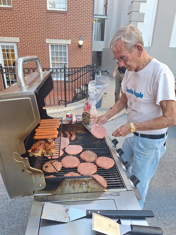 Tuesday, 3 Sep 2024, St. John's Council holds its last monthly family picnic for the summer season behind St. John the Evangelist Church. Br. Pete Tokar mans the grill.