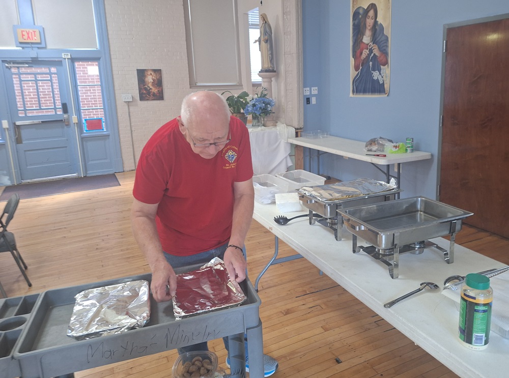 Tuesday, 8 Oct 2024. A team of Knights prepare and serve a meal to over 60 men at Fr. Matt DeFusco's monthly Men's Formation Feast in the hall of St. John the Evangelist Church, Frederick, MD.