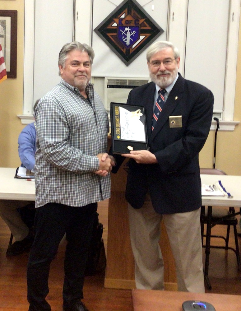 November 19, 2024. Former District Deputy (FDD) No. 25 Tom Plunkett, a current member and Past Grand Knight of St. John's Council 1622, was presented the "STAR DISTRICT AWARD" at the Nov 19 St. John's council membership meeting from the Maryland State Council for the recent 2023-2024 Fraternal Year. This is a prestigious award to District Deputies who provide continuous direct support for the Maryland State Council to a group of 4-5 individual councils.