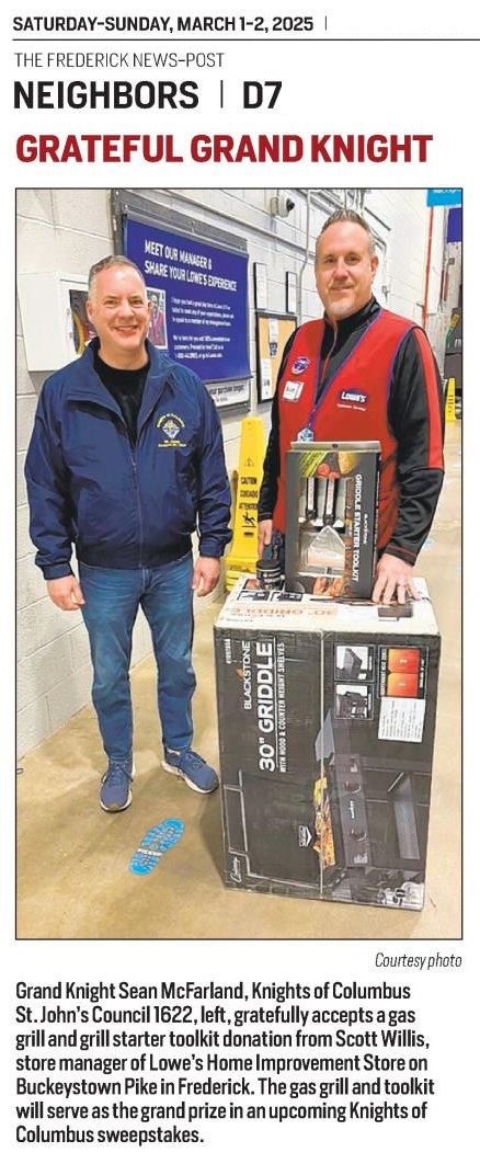 February 21, 2025. Grand Knight Sean McFarland, Knights of Columbus St. John's Council 1622 (left), gratefully accepts a gas grill and grill starter toolkit donation from Mr. Scott Willis, Store Manager of Lowe's Home Improvement Store on MD Route 85, Buckeystown Pike, Frederick MD. The gas grill and toolkit will serve as the Grand Prize in an upcoming Knights of Columbus sweepstakes.