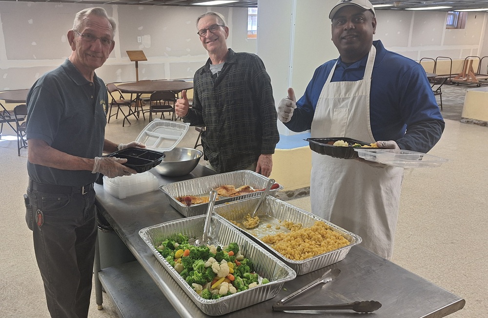 Friday, March 21, 2025. Our third St. John's Council 1622 2025 Friday Lenten Fish Dinner at St. John the Evangelsi Church, Frederick, MD. Photo (LtoR): Preparing to-go orders, Br. Pete Tokad, PGK Jim Sier, and Br. Jay Perera.