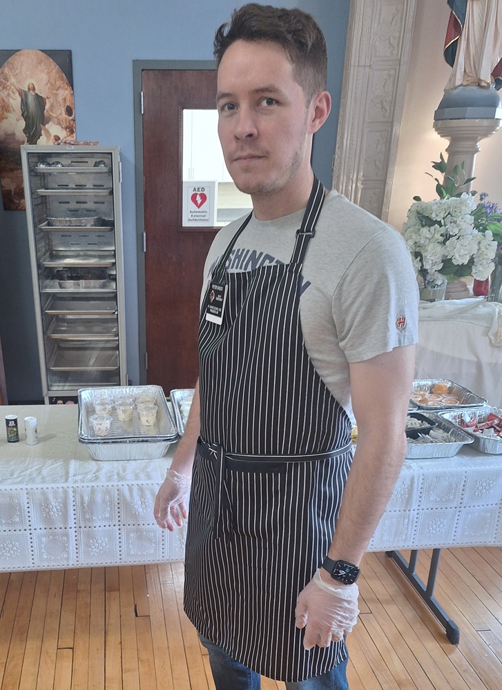 Friday, March 21, 2025. Our third St. John's Council 1622 2025 Friday Lenten Fish Dinner at St. John the Evangelsi Church, Frederick, MD. Photo: Br. Peter Shuck at the serving line.