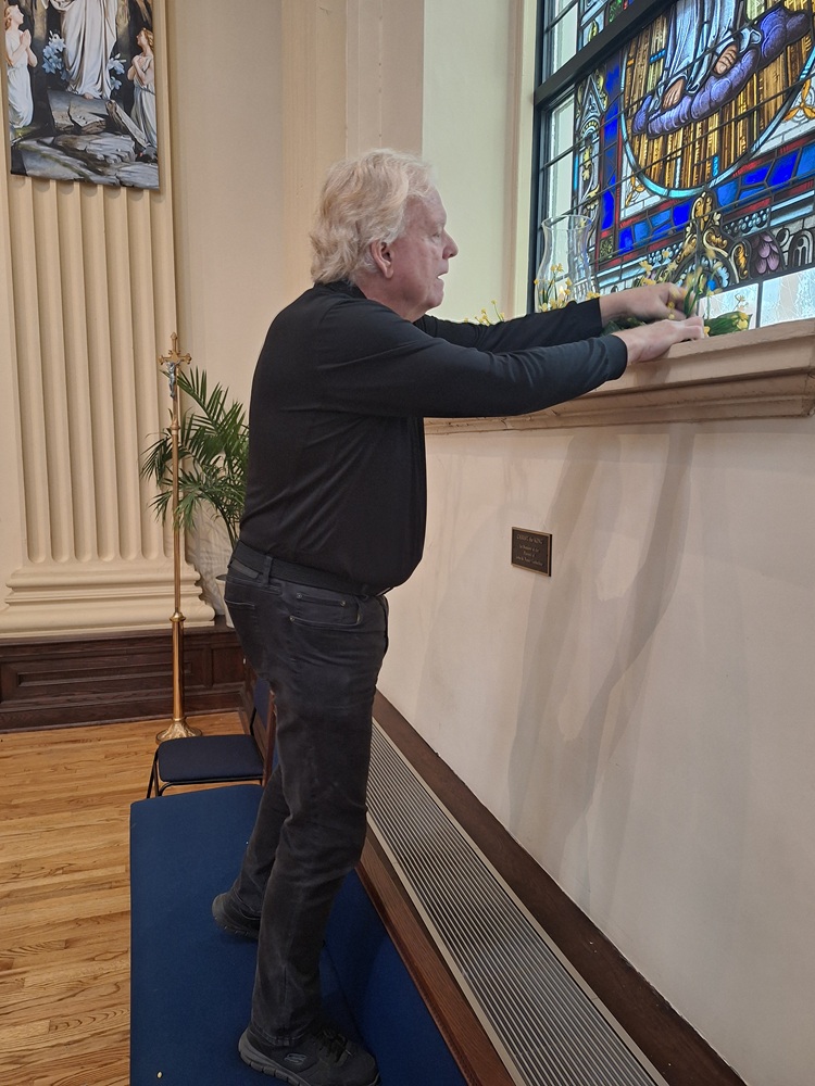 Saturday, April 19, 2025. St. John's Council 1622 members help with Easter decorations at St. John the Evandelist Church. Photo: Br. William Key, Council 1622 church activities coordinator.