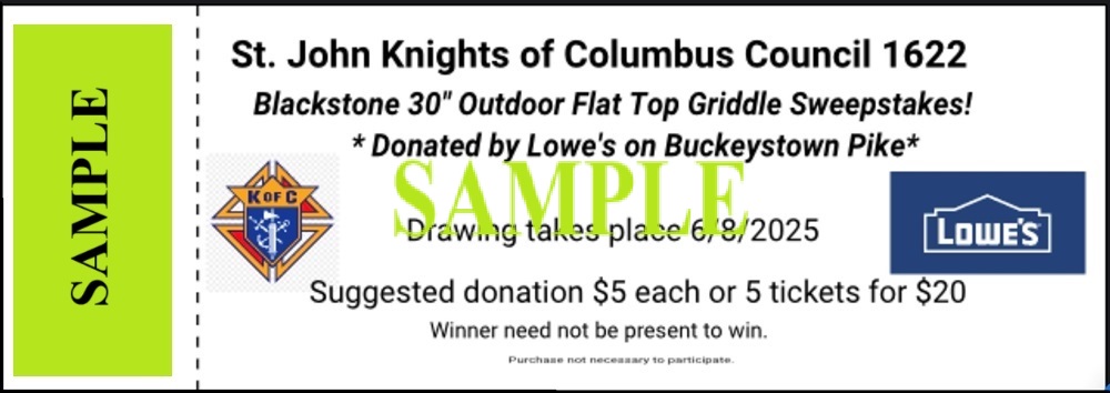 Sunday, June 8, 2025. Knights draw the winning ticket after Masses our 2025 Flat Top Griddle Sweepstakes by St. John's Council 1622. Our Sweepstakes chairman is Br. Bobby McQuin. Grill donated by Lowe's Home Improvement, on MD Route 85 in Frederick.