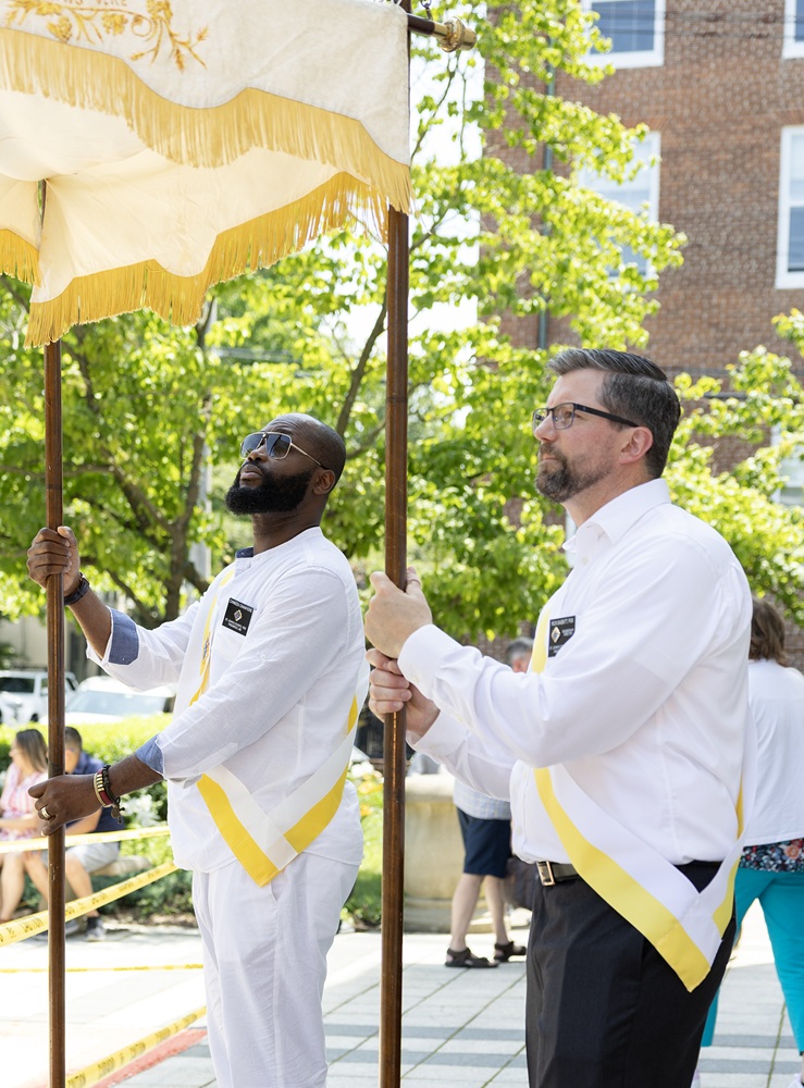 Photo (LtoR): Knights stage to carry canopy for the procession, Br. Chinedu Ohanyere and PGK Rick Babbitt.