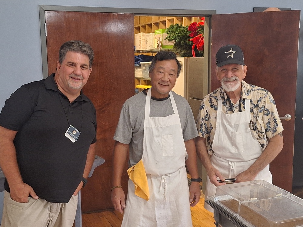 Tuesday, July 8, 2025, Knights prepare and serve a meal at Fr. Matt's monthly Men's Formation Feast. (LtoR): Br. Jerry Crepizzi, Br. Maurice Wong, and PGK Rick Casazza.
