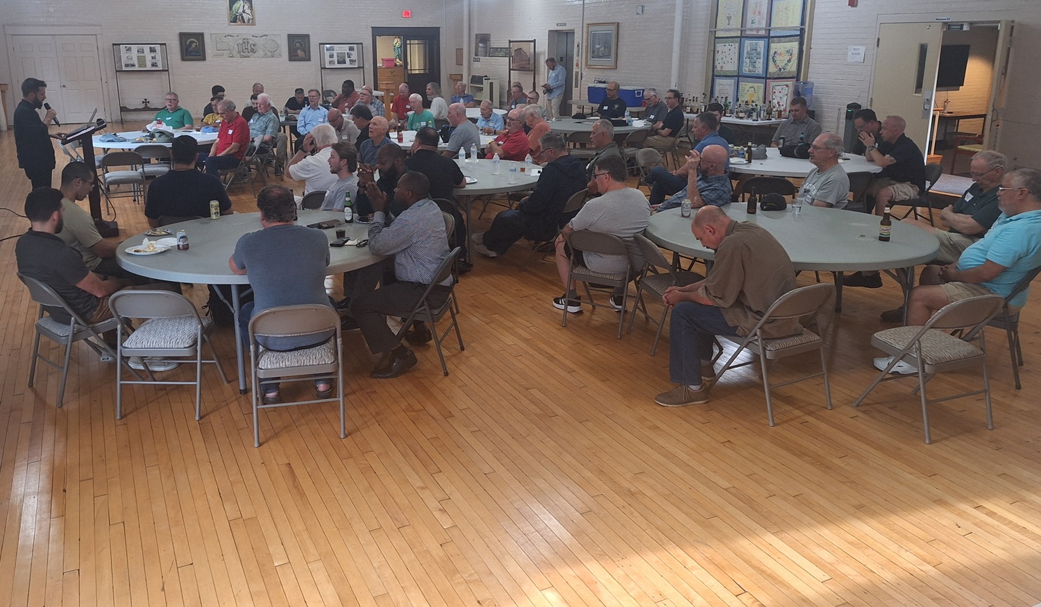 Tuesday, July 8, 2025, Knights prepare and serve a meal at Fr. Matt's monthly Men's Formation Feast. Fr. Matt DeFusco addresses the attendees.