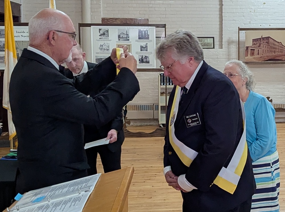 Photo: District 25 Deputy, Br. John Szarnicki, installs incoming Treasurer PFN William D Bill Cutchin, with Bill's wife Lisa observing.