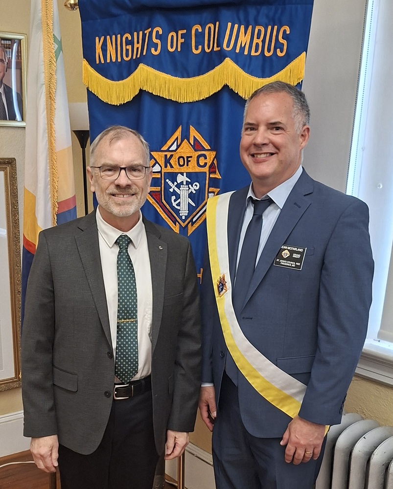 Tuesday, Sep 21, 2025, St. John's Council 1622 conducts a degree exemplification ceremony for new members in Room 10 of the Parish Center at St. John the Evagelist Church, Frederick, MD. Photo: New member Tim Meyers and Grand Knight Sean McFarland.