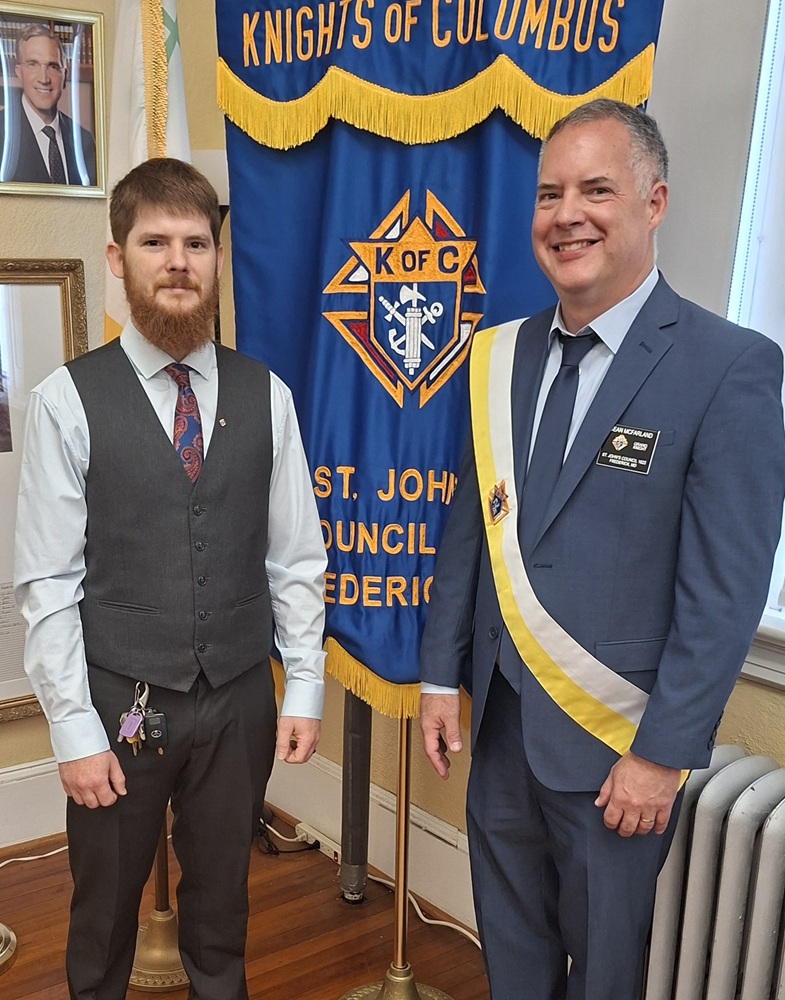 Tuesday, Sep 21, 2025, St. John's Council 1622 conducts a degree exemplification ceremony for new members in Room 10 of the Parish Center at St. John the Evagelist Church, Frederick, MD. Photo: New member David Snope and Grand Knight Sean McFarland.