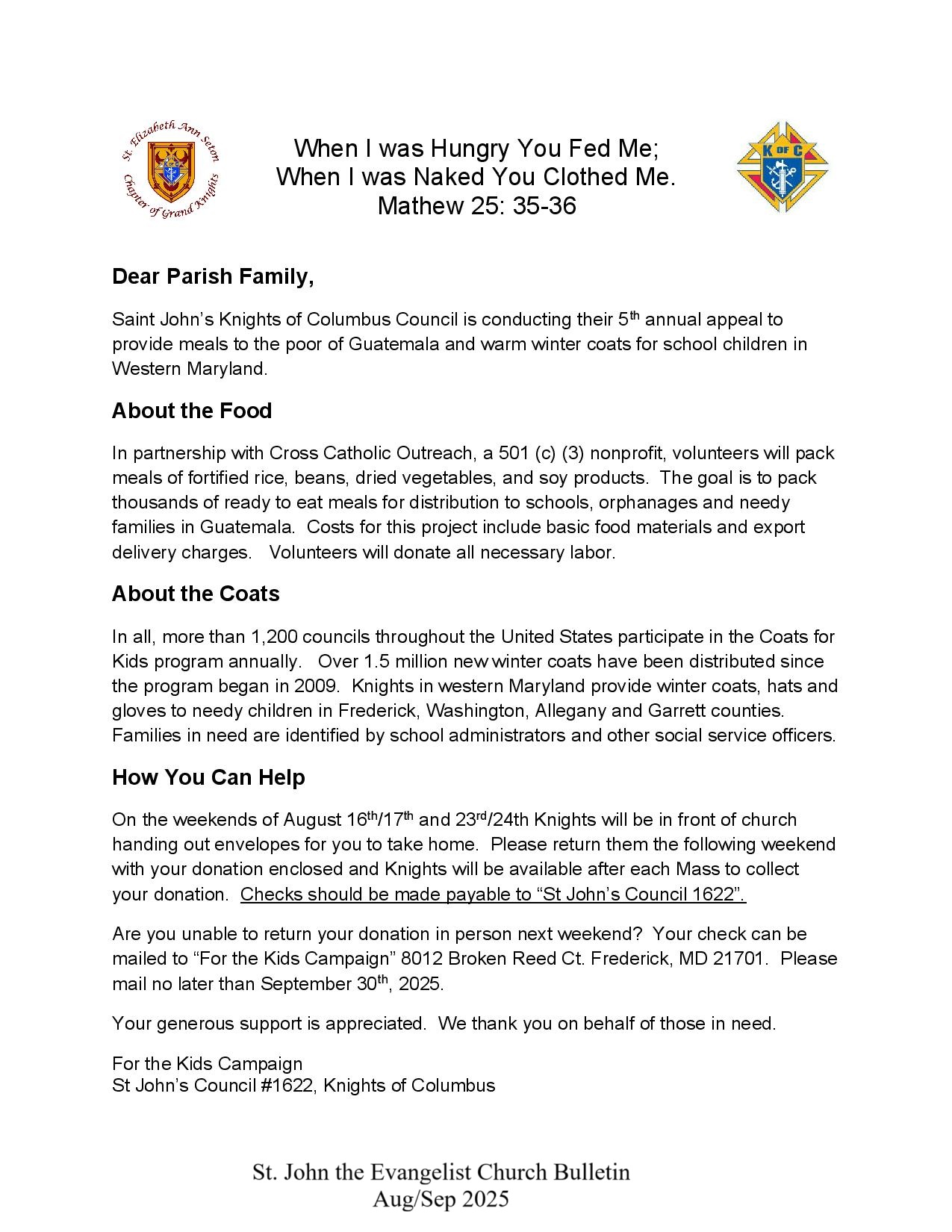 A Knights of Columbus insert for the bulletin of St. John the Evangelist Church during August and September 2025 for our annual "For the Kids" appeal. Funds collected are provided to two programs, one providing winter coats to children in Western Maryland, and one providing packaged meals to families in Guatemala. Our appeal effort was finished at the end of September. Our appeal coordinator was PGK Rick Casazza.
