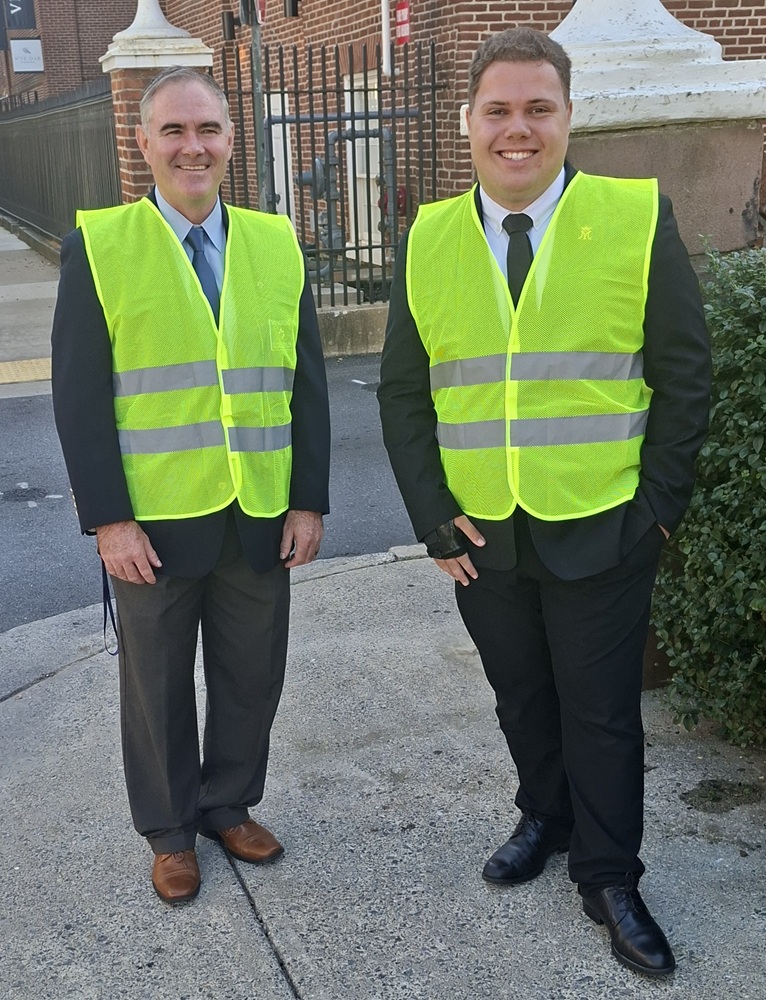 Knights serving as road guards to procession to and from St. John's Cemetery. (LtoR) Br. Troy Kiessling and Br. Alex Sohm. Br. Alex is visiting home from attending his seminary in Washington DC.