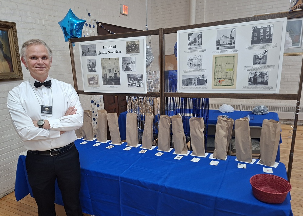 Oct 11, Knights of Columbus, St. John's Council 1622 hosted the "Una Notte In Toscana" Dinner Fundraiser benefiting the Restoration of our century-old St. Margaret Bauer Center. Br. Gene Sterling stands at a raffle table.