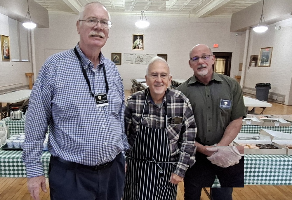 Sunday, Oct 26, 2025, Knights host a Coffee and Donut Social after Masses at St. John the Evangelist Church, Frederick, MD. (LtoR) PGK Dave Satterfield, Br. Woody Johnston (Donut Social Coordinator), and Br. John Cipollo.