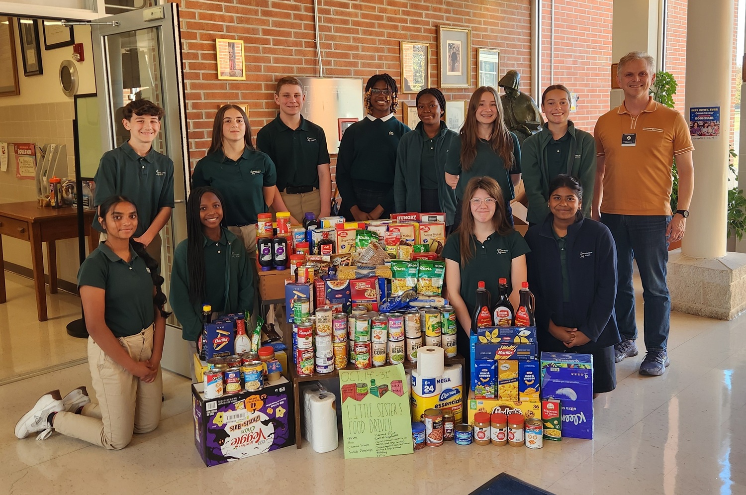 Photo: Br. Gene Sterling (on right) with students from the Seton School in Emmitsburg, MD, who donated supplies from their food drive to the Little Sisters of the Poor.