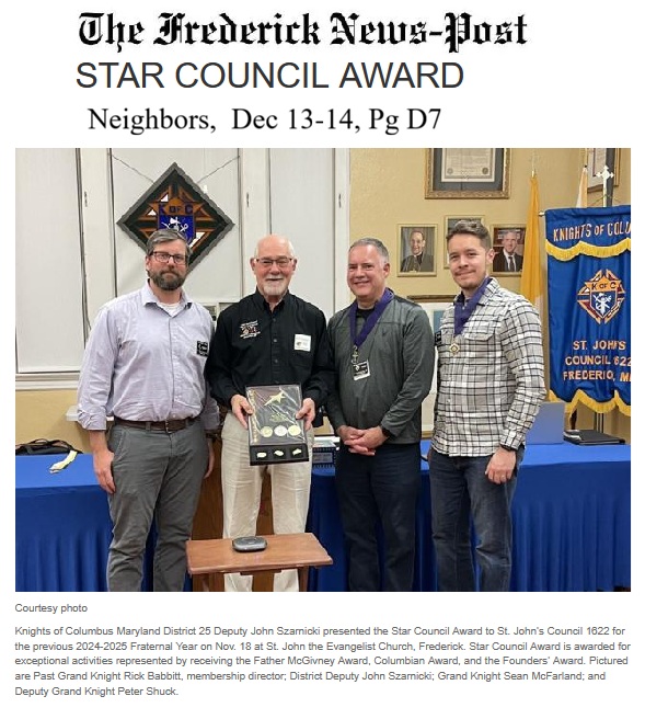 Nov 18, 2025. At our monthly membership meeting in our Council Chamber at St. John the Evangelist Church, KofC Maryland District 25 Deputy John Szarnicki presented the Star Council Award to St. John's Council 1622 for the previous 2024-2025 Fraternal Year.